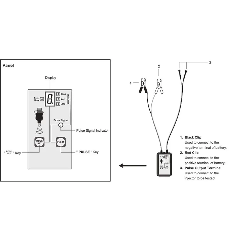 Особенность изделия EM276: Этот тестер может диагностировать проблемы с инжектором, вы можете использовать его на каждом инжекторе индивидуально для тестирования застрявшей, протекающей или перегоревшей. В качестве источника питания использовался автомобильный аккумулятор 12 В. Он имеет 4 импульсных режима и в режиме непрерывной работы (режим 4 ), он может помочь вам определить хороший инжектор или нет, когда вы выключаете двигатель. Режим блокировки обеспечивает одинаковое состояние тестирования. Он может работать с любым тестером давления топлива вместе. EM276 инструкции по эксплуатации: Выключить двигатель транспортного средства Подключите черный/красный зажим к отрицательному/положительному разъему батареи Подключите импульсный выходной терминал к топливной форсунке Нажмите клавишу "MODE SET", чтобы выбрать нужный импульсный режим Нажмите кнопку «PULSE», тестер выдаст импульс на инжектор, а затем импульсный сигнал Индикатор светильник тся как индикатор Пояснения для 4 режимов Режим 1: Тестер выдает 1 импульс, ширина которого составляет около 250 мс Режим 2: тестер выдает 50 импульсов, ширина каждого импульса составляет около 7 мс Режим 3: тестер выдает 100 импульса, ширина каждого импульса составляет около 3,5 мс Режим 4: тестер выводит Пульс непрерывно из расчета 50 импульсов примерно на 1450 мс, Ширина каждого импульса составляет около 7 мс Спецификация EM276: Питание: 12 в автомобильный аккумулятор Рабочая среда: 0 C - 40C, относительная влажность <80% Среда хранения: -10 C - 50C, относительная влажность <85% Размер: 147x82x29 мм (только для основного корпуса) Вес: около 165 г